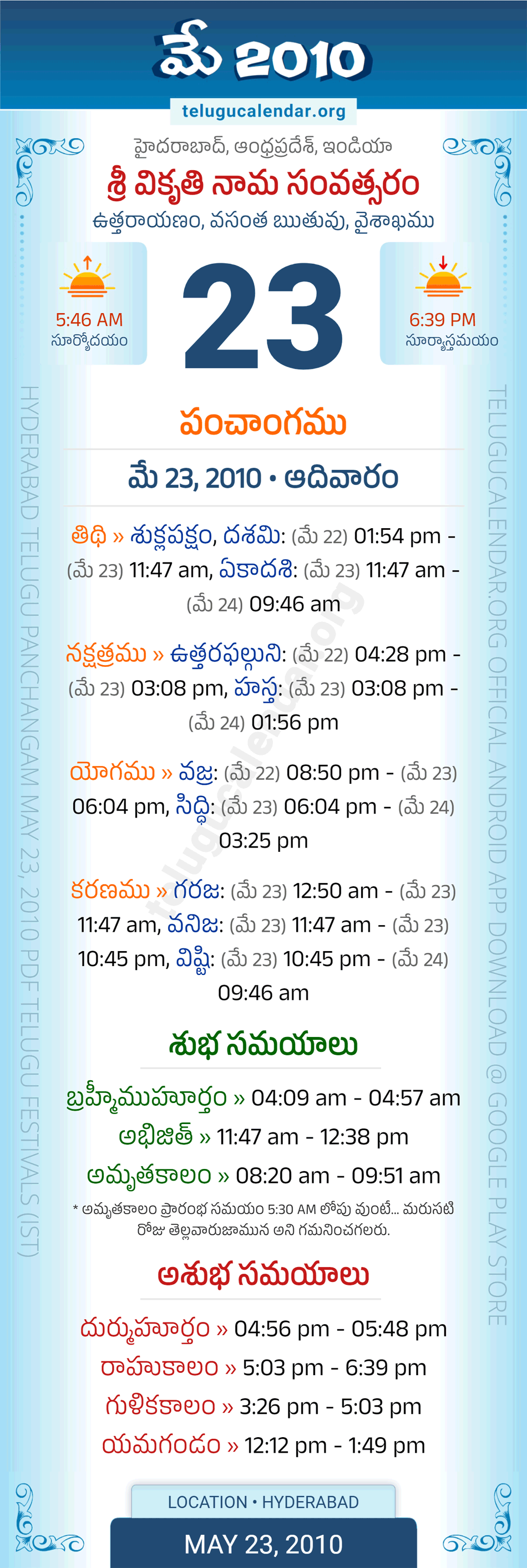 Download » May 23, 2010 » Hyderabad, Andhra Pradesh Telugu Calendar Panchangam Daily Sheet with Auspicious and Inauspicious Timings.