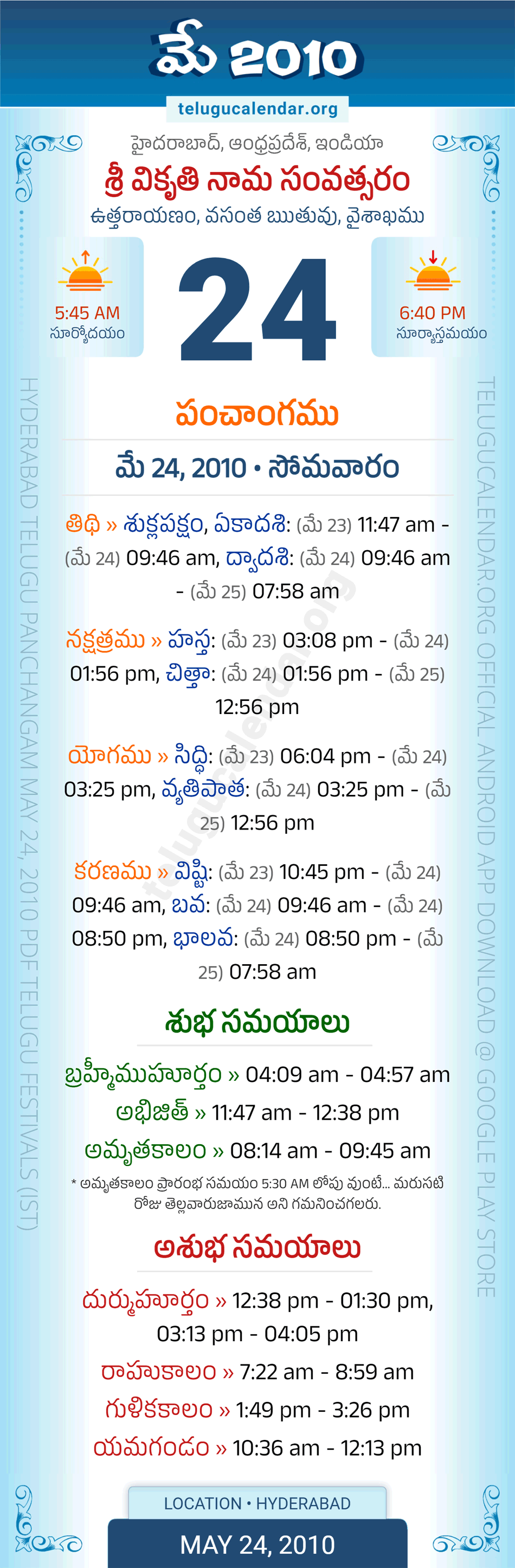 Download » May 24, 2010 » Hyderabad, Andhra Pradesh Telugu Calendar Panchangam Daily Sheet with Auspicious and Inauspicious Timings.