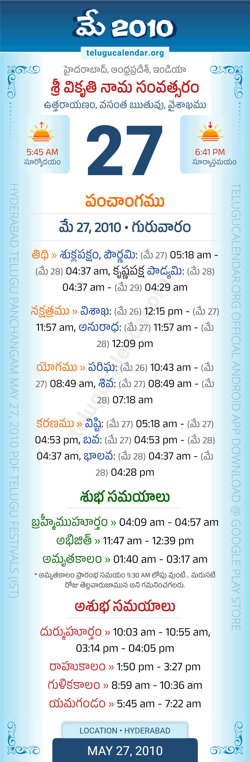 Download » May 27, 2010 » Hyderabad, Andhra Pradesh Telugu Calendar Panchangam Daily Sheet with Auspicious and Inauspicious Timings.