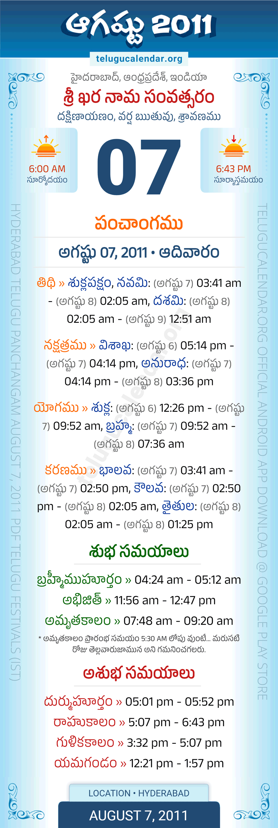 Download » August 7, 2011 » Hyderabad, Andhra Pradesh Telugu Calendar Panchangam Daily Sheet with Auspicious and Inauspicious Timings.