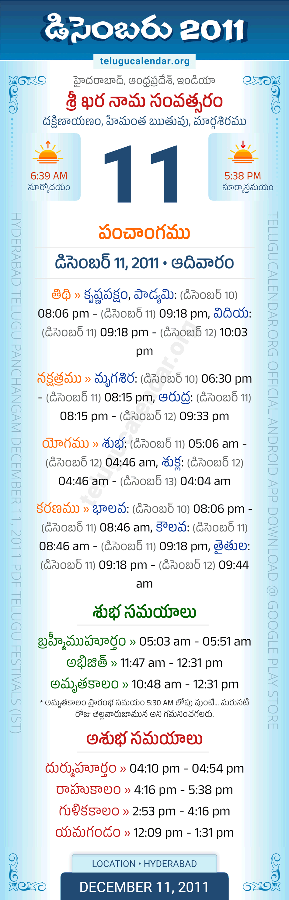 Download » December 11, 2011 » Hyderabad, Andhra Pradesh Telugu Calendar Panchangam Daily Sheet with Auspicious and Inauspicious Timings.