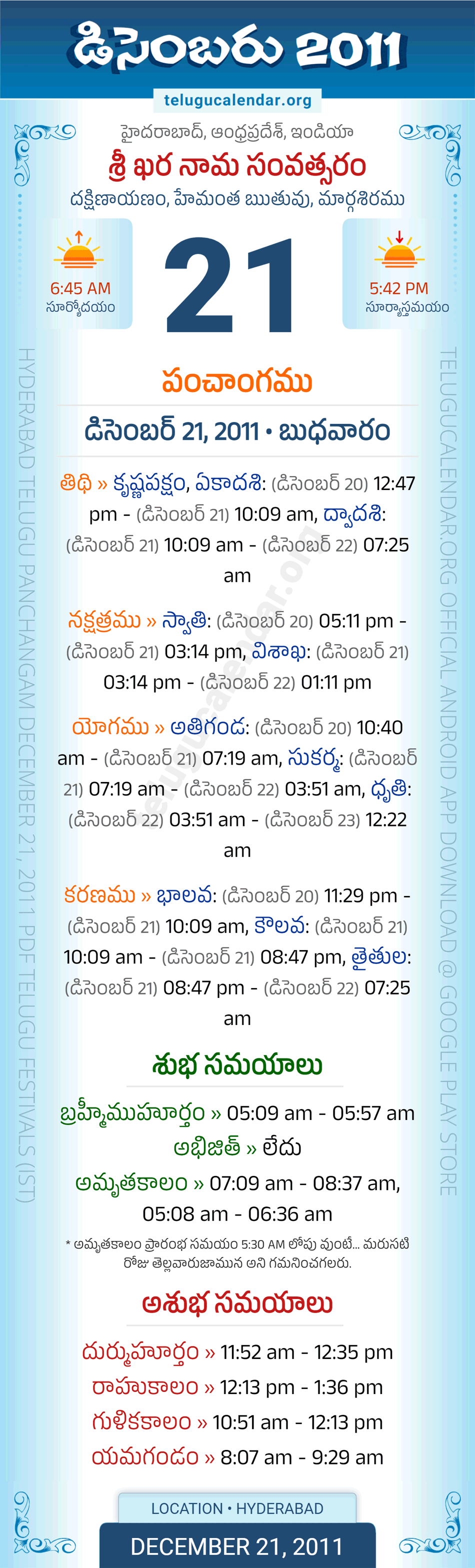 Download » December 21, 2011 » Hyderabad, Andhra Pradesh Telugu Calendar Panchangam Daily Sheet with Auspicious and Inauspicious Timings.