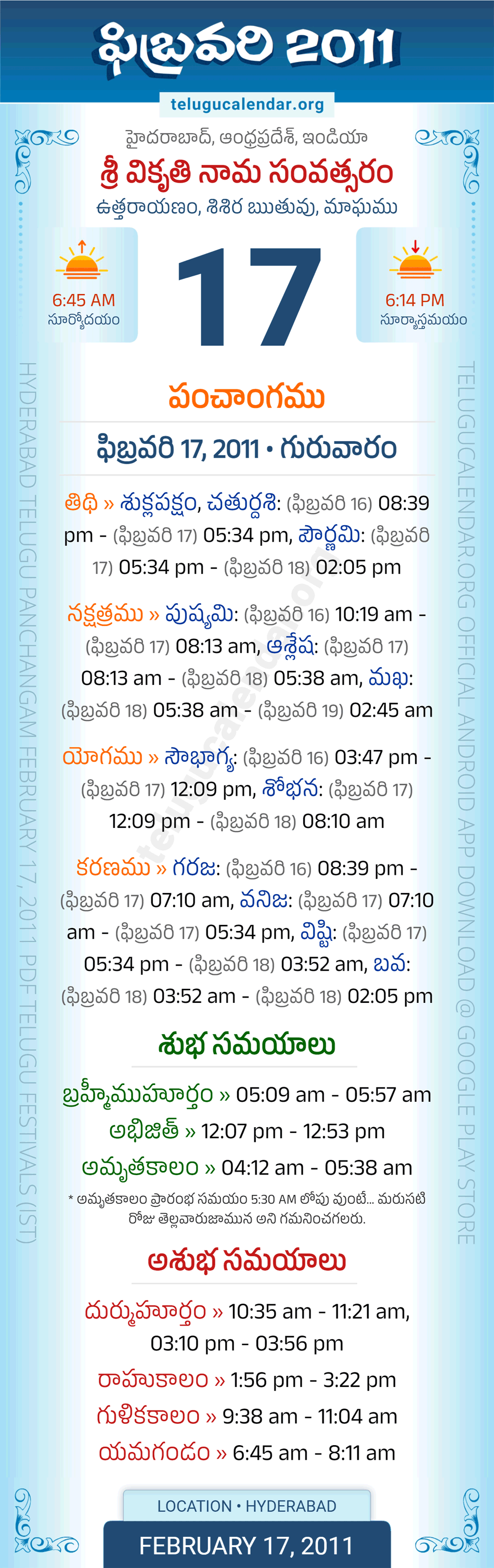 Download » February 17, 2011 » Hyderabad, Andhra Pradesh Telugu Calendar Panchangam Daily Sheet with Auspicious and Inauspicious Timings.