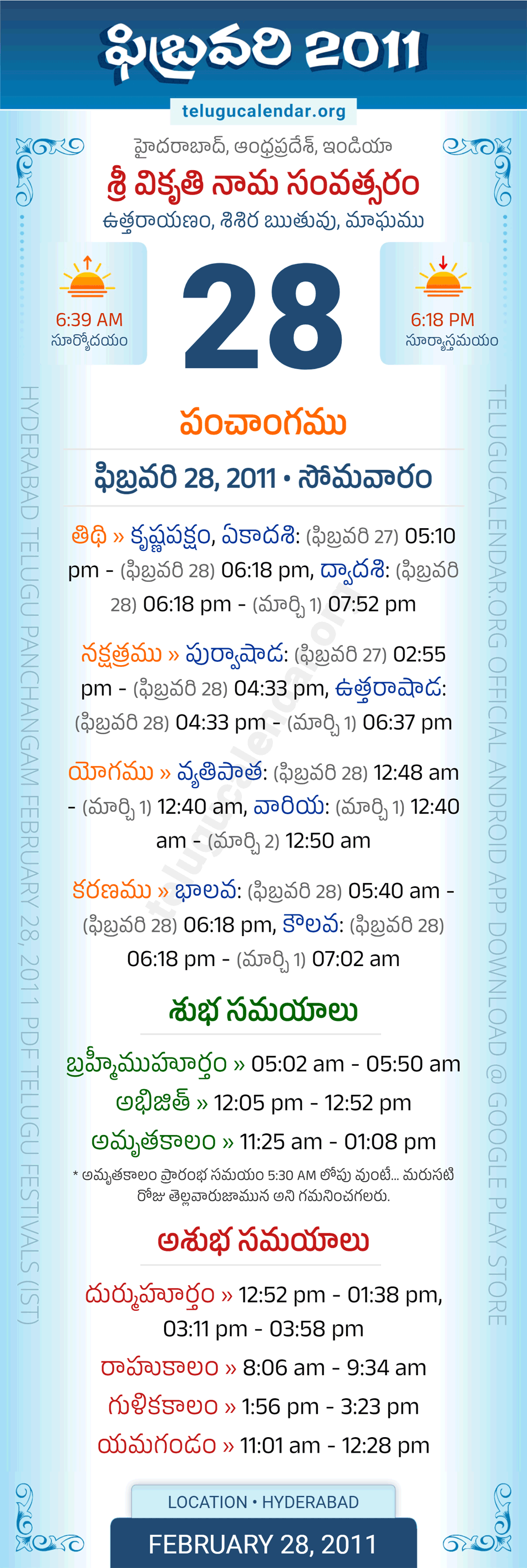 Download » February 28, 2011 » Hyderabad, Andhra Pradesh Telugu Calendar Panchangam Daily Sheet with Auspicious and Inauspicious Timings.