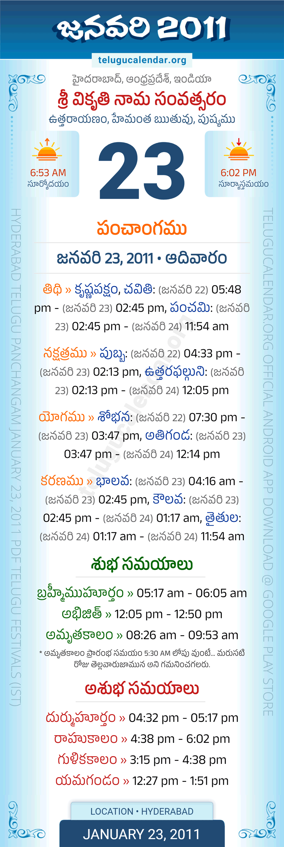 Download » January 23, 2011 » Hyderabad, Andhra Pradesh Telugu Calendar Panchangam Daily Sheet with Auspicious and Inauspicious Timings.