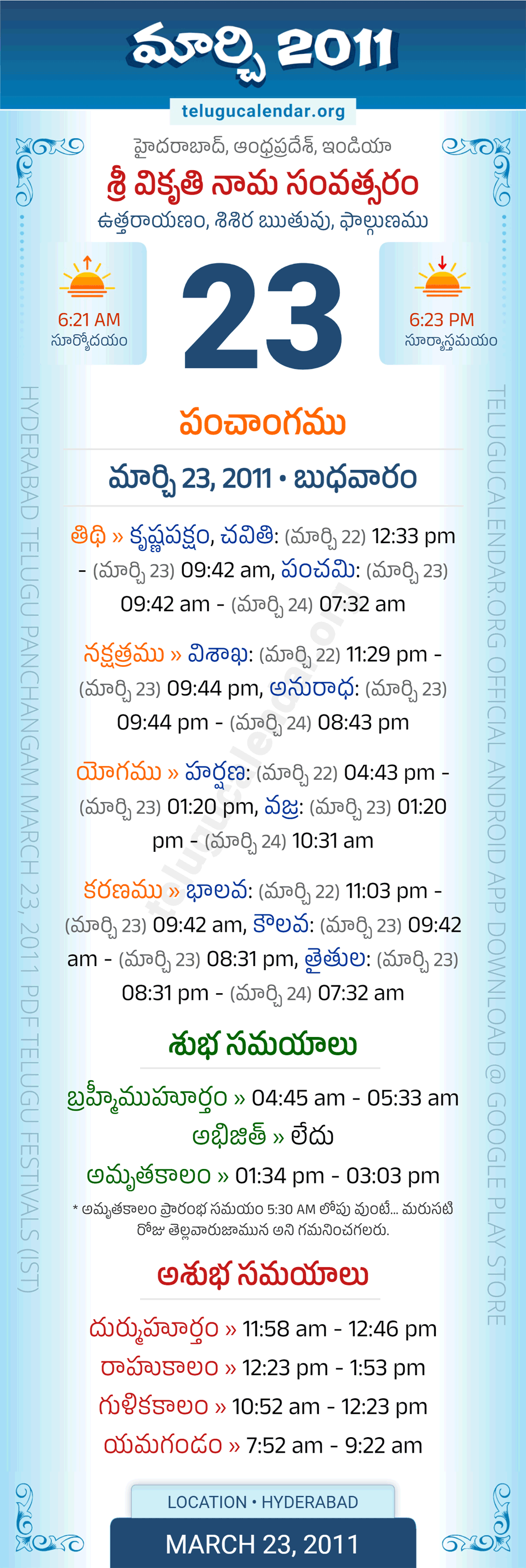 Download » March 23, 2011 » Hyderabad, Andhra Pradesh Telugu Calendar Panchangam Daily Sheet with Auspicious and Inauspicious Timings.