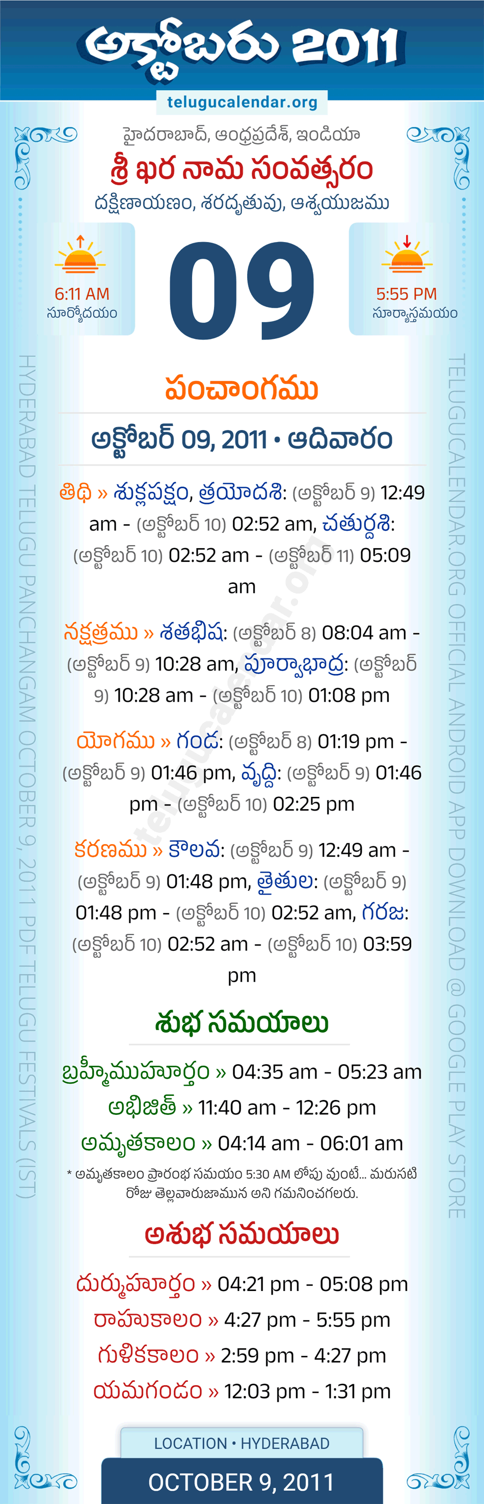 Download » October 9, 2011 » Hyderabad, Andhra Pradesh Telugu Calendar Panchangam Daily Sheet with Auspicious and Inauspicious Timings.