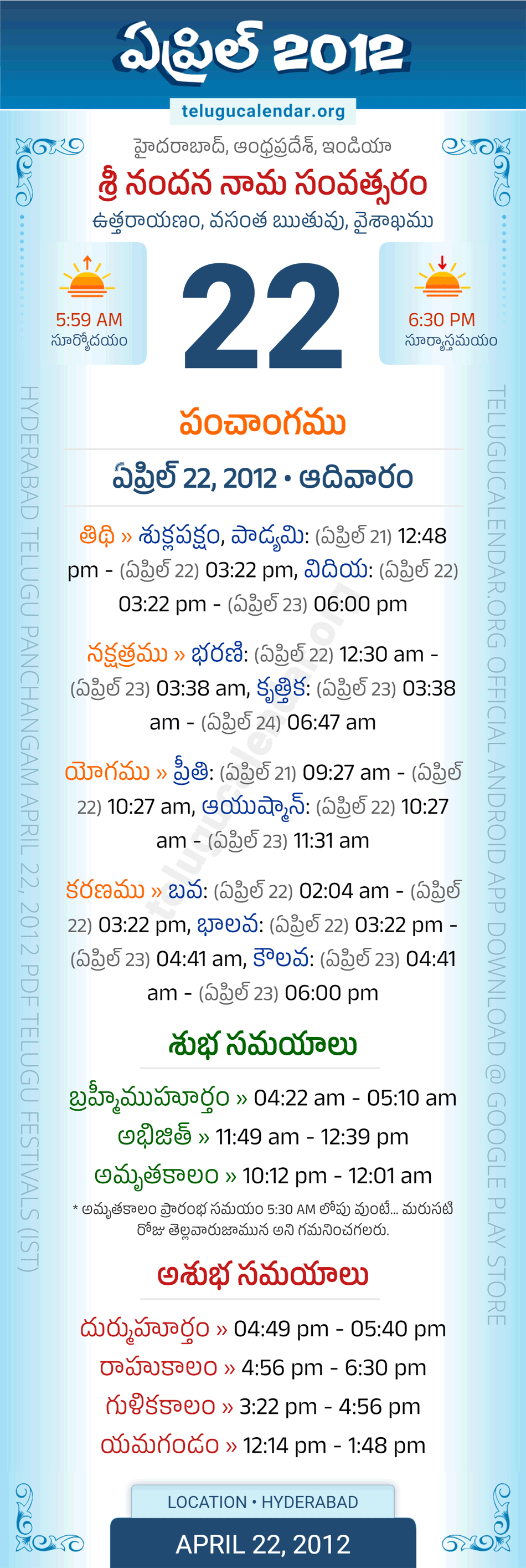 Download » April 22, 2012 » Hyderabad, Andhra Pradesh Telugu Calendar Panchangam Daily Sheet with Auspicious and Inauspicious Timings.