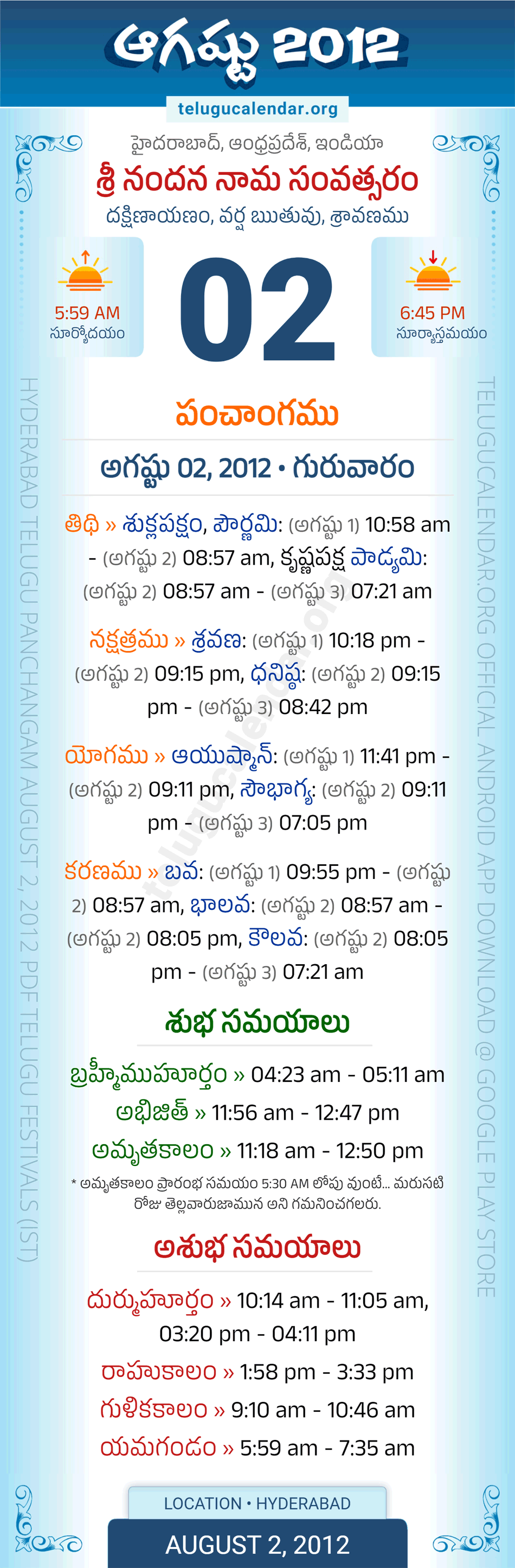 Download » August 2, 2012 » Hyderabad, Andhra Pradesh Telugu Calendar Panchangam Daily Sheet with Auspicious and Inauspicious Timings.