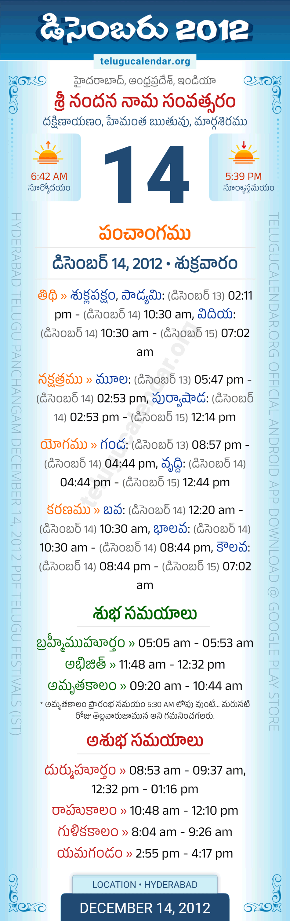 Download » December 14, 2012 » Hyderabad, Andhra Pradesh Telugu Calendar Panchangam Daily Sheet with Auspicious and Inauspicious Timings.