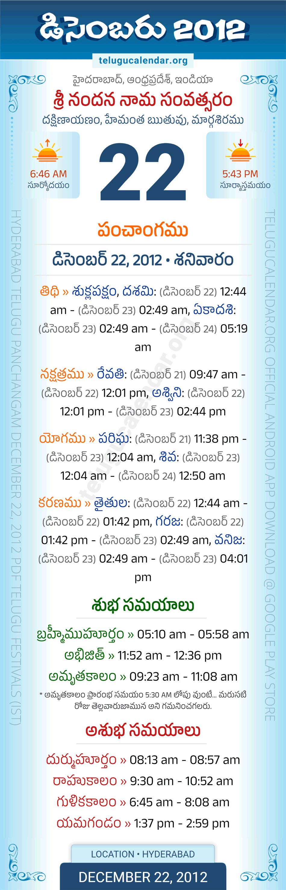 Download » December 22, 2012 » Hyderabad, Andhra Pradesh Telugu Calendar Panchangam Daily Sheet with Auspicious and Inauspicious Timings.