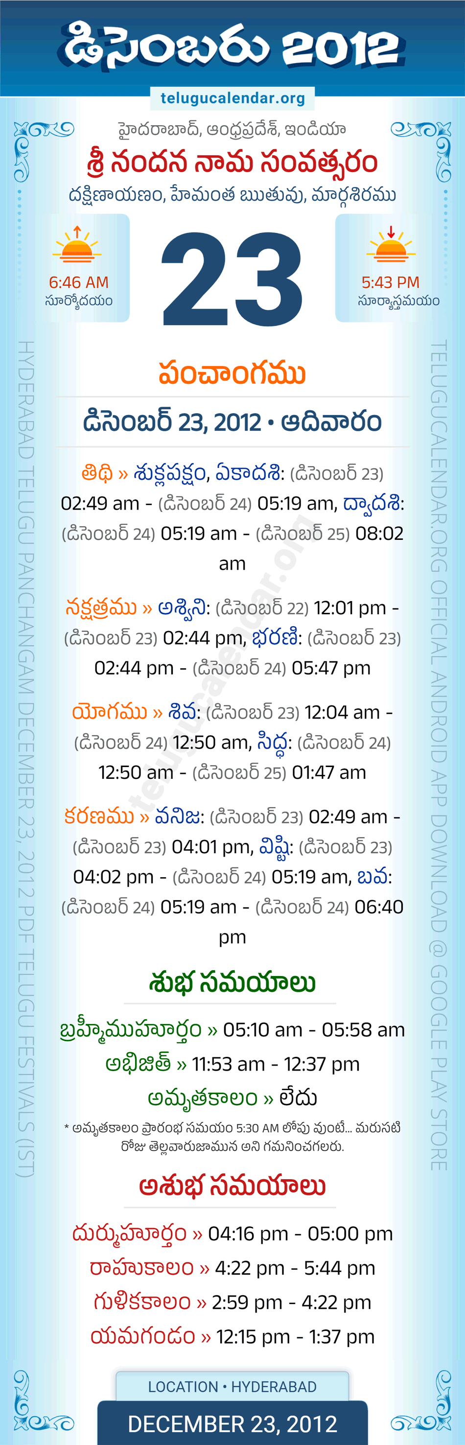Download » December 23, 2012 » Hyderabad, Andhra Pradesh Telugu Calendar Panchangam Daily Sheet with Auspicious and Inauspicious Timings.