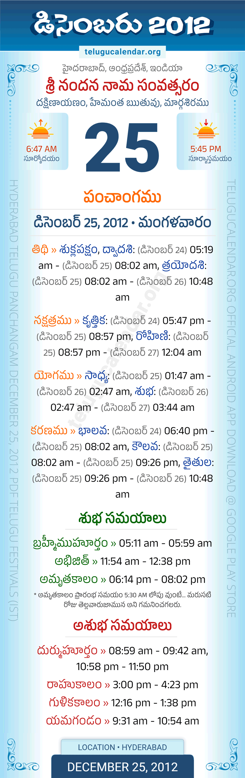 Download » December 25, 2012 » Hyderabad, Andhra Pradesh Telugu Calendar Panchangam Daily Sheet with Auspicious and Inauspicious Timings.