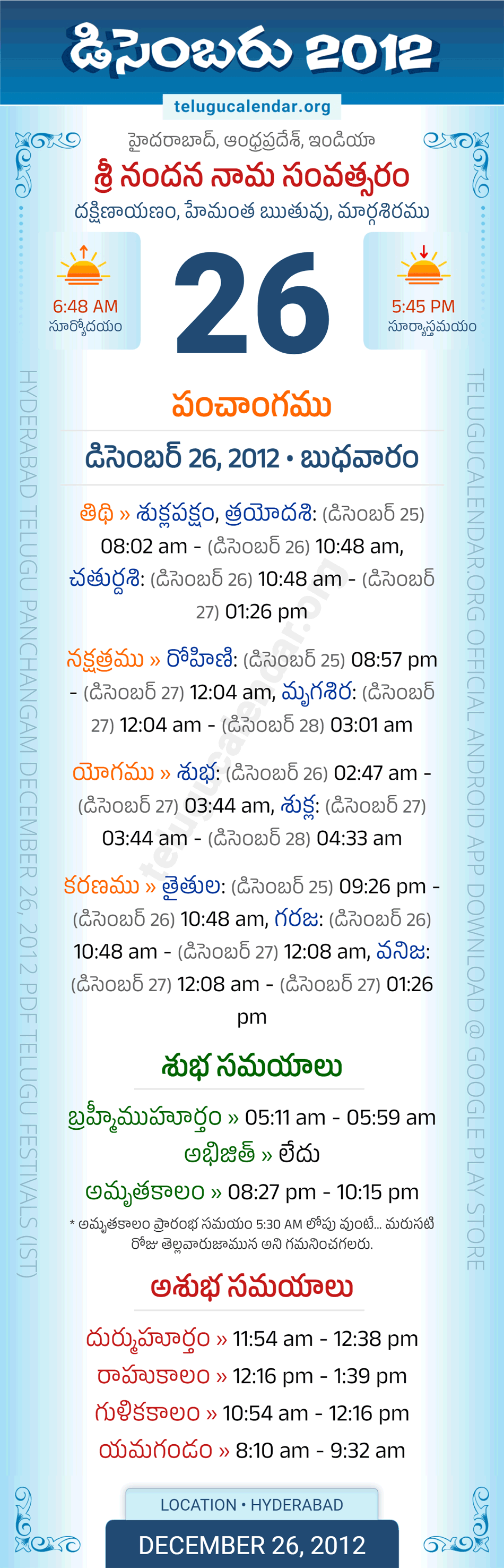 Download » December 26, 2012 » Hyderabad, Andhra Pradesh Telugu Calendar Panchangam Daily Sheet with Auspicious and Inauspicious Timings.