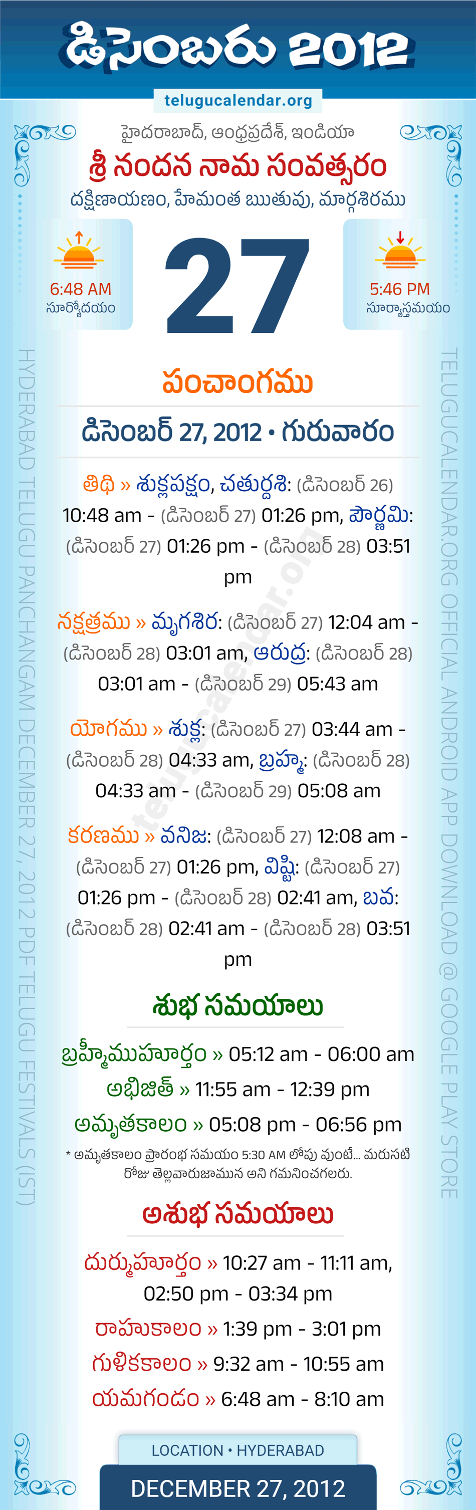 Download » December 27, 2012 » Hyderabad, Andhra Pradesh Telugu Calendar Panchangam Daily Sheet with Auspicious and Inauspicious Timings.