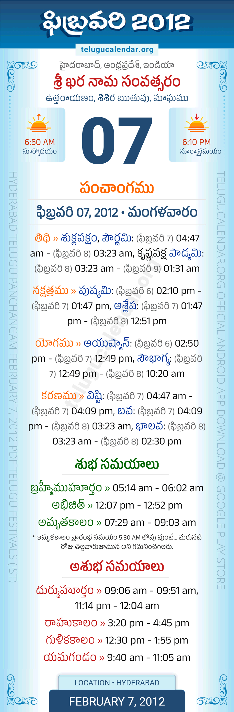 Download » February 7, 2012 » Hyderabad, Andhra Pradesh Telugu Calendar Panchangam Daily Sheet with Auspicious and Inauspicious Timings.