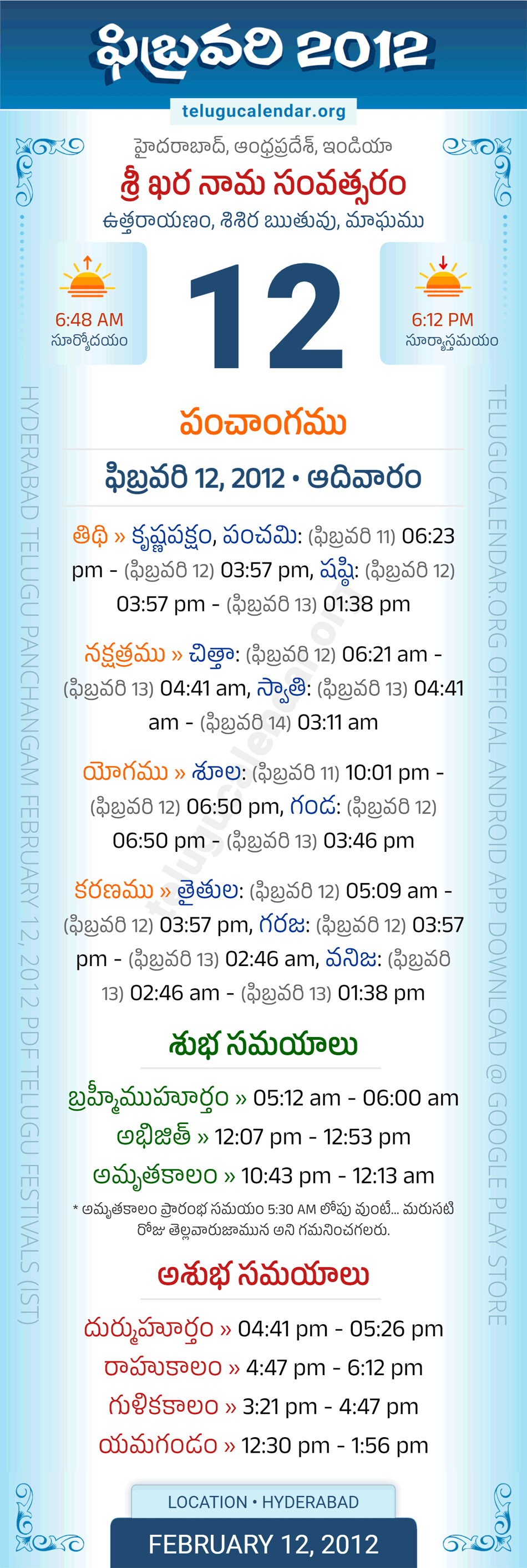 Download » February 12, 2012 » Hyderabad, Andhra Pradesh Telugu Calendar Panchangam Daily Sheet with Auspicious and Inauspicious Timings.