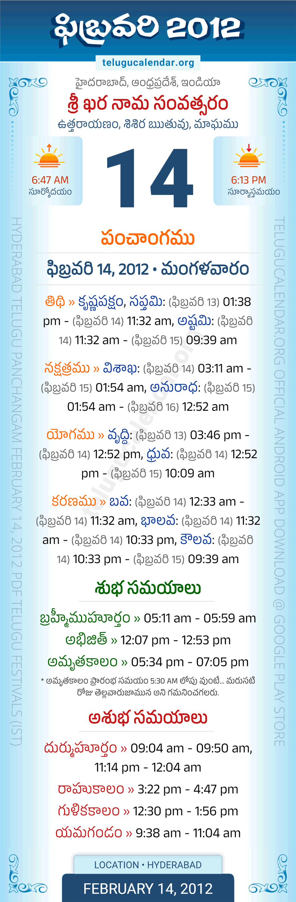 Download » February 14, 2012 » Hyderabad, Andhra Pradesh Telugu Calendar Panchangam Daily Sheet with Auspicious and Inauspicious Timings.
