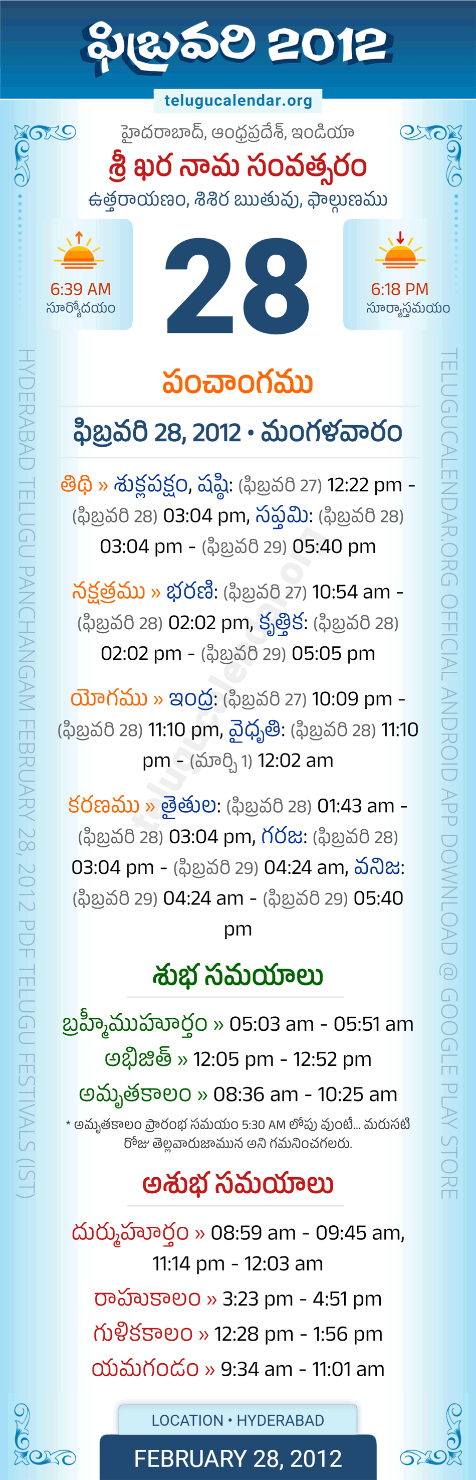 Download » February 28, 2012 » Hyderabad, Andhra Pradesh Telugu Calendar Panchangam Daily Sheet with Auspicious and Inauspicious Timings.