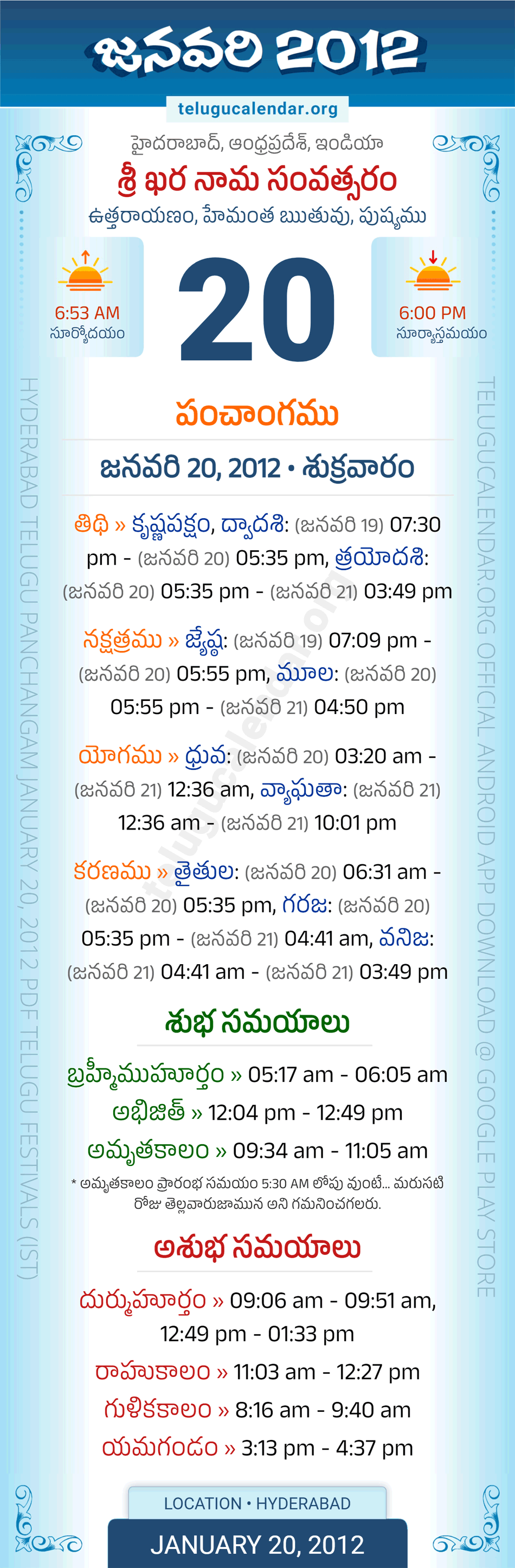 Download » January 20, 2012 » Hyderabad, Andhra Pradesh Telugu Calendar Panchangam Daily Sheet with Auspicious and Inauspicious Timings.