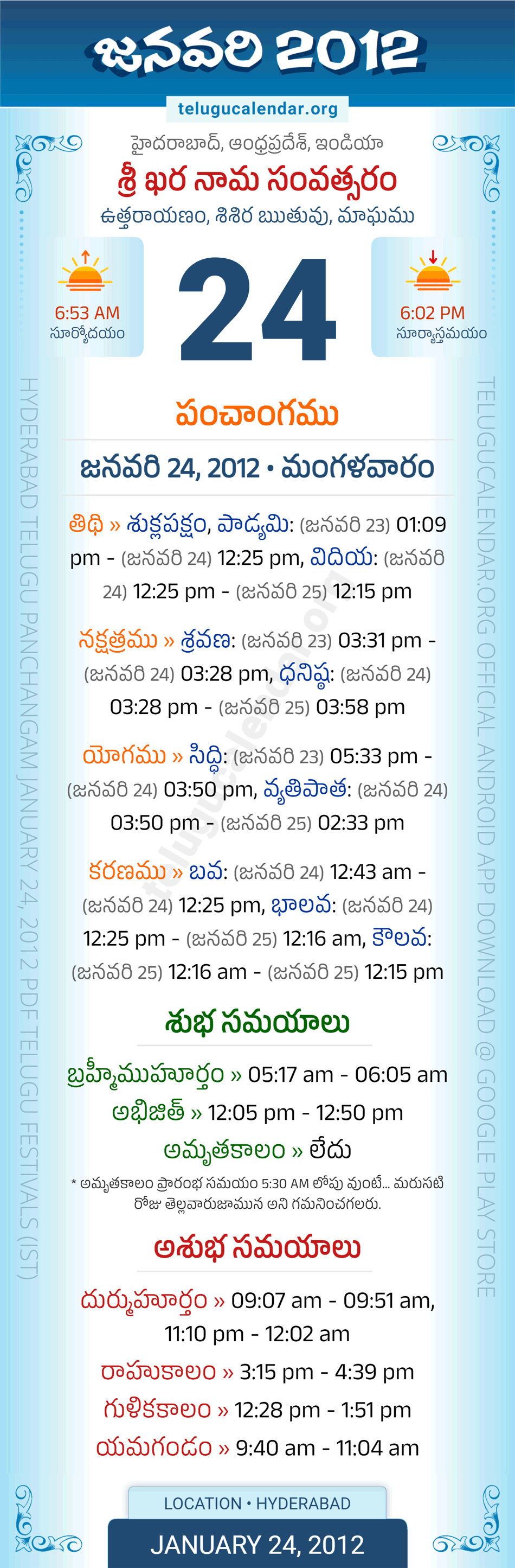 Download » January 24, 2012 » Hyderabad, Andhra Pradesh Telugu Calendar Panchangam Daily Sheet with Auspicious and Inauspicious Timings.