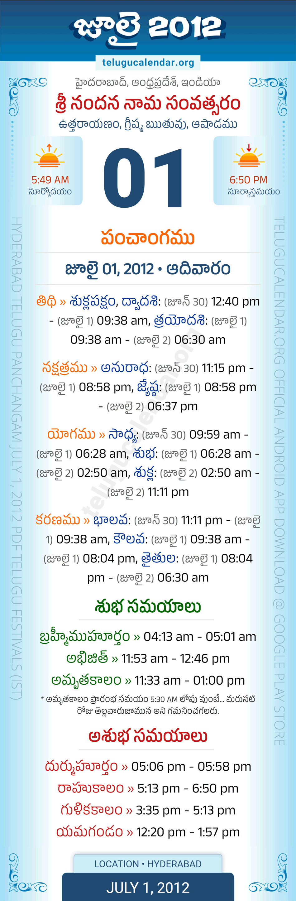 Download » July 1, 2012 » Hyderabad, Andhra Pradesh Telugu Calendar Panchangam Daily Sheet with Auspicious and Inauspicious Timings.