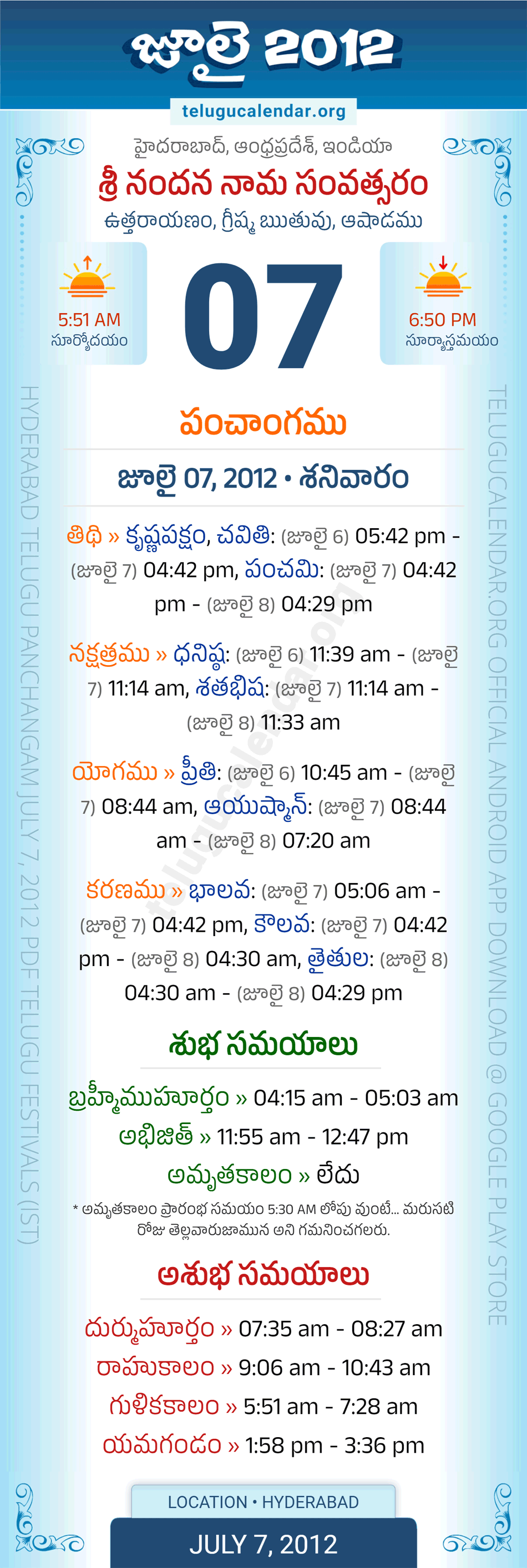 Apart from the Panchangam 2012, you can also find the Sunrise and Sunset (Middle Limb) timings, Paksham, Telugu Year, Yanam, Rutuvu, Telugu Month for Hyderabad. Auspicious Period July 7, 2012 for Hyderabad (Today Good Timings like Abhijit Muhurtham, Amruta Kalam & Brahma Muhurtham) and Inauspicious Period July 7, 2012 for Hyderabad (Bad Timings like Durmuhurtham, Rahukalam, Gulika kalam & Yamagandam) with starting and end timings in the above image in Telugu Language.