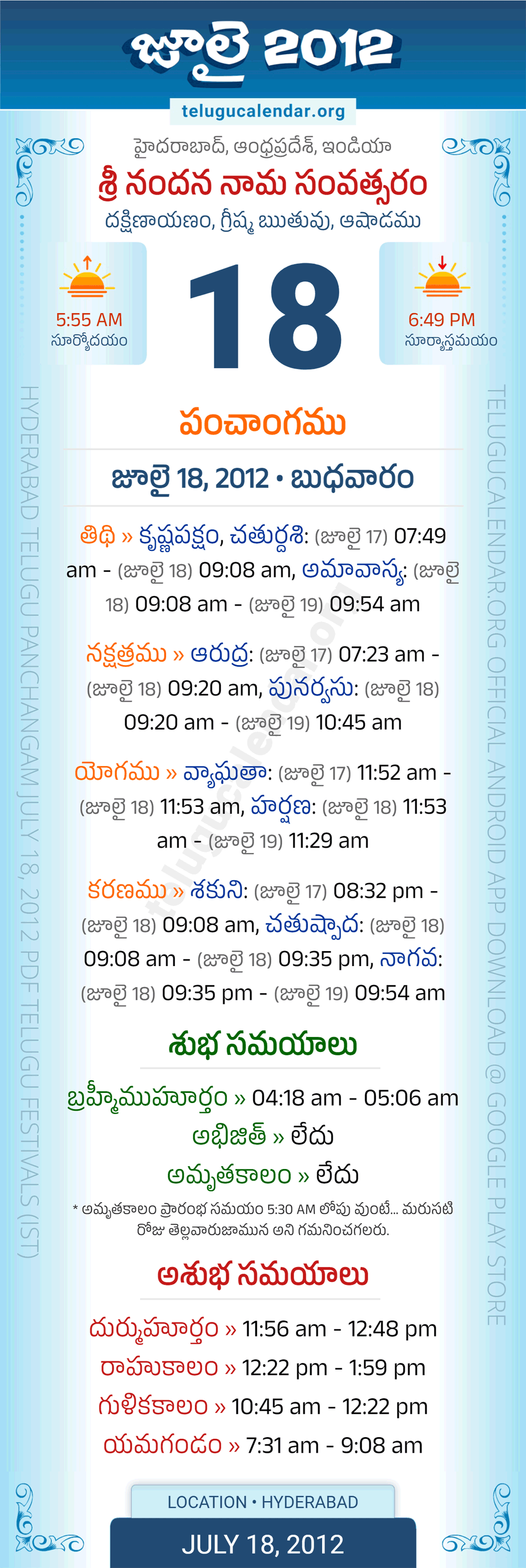 Download » July 18, 2012 » Hyderabad, Andhra Pradesh Telugu Calendar Panchangam Daily Sheet with Auspicious and Inauspicious Timings.