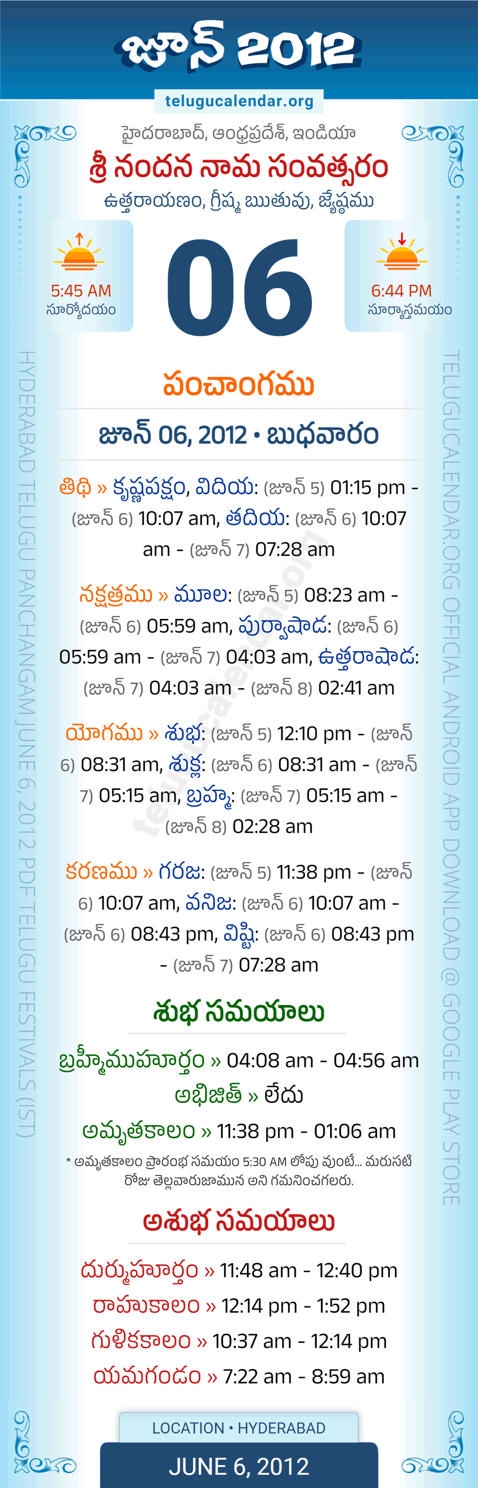 Download » June 6, 2012 » Hyderabad, Andhra Pradesh Telugu Calendar Panchangam Daily Sheet with Auspicious and Inauspicious Timings.