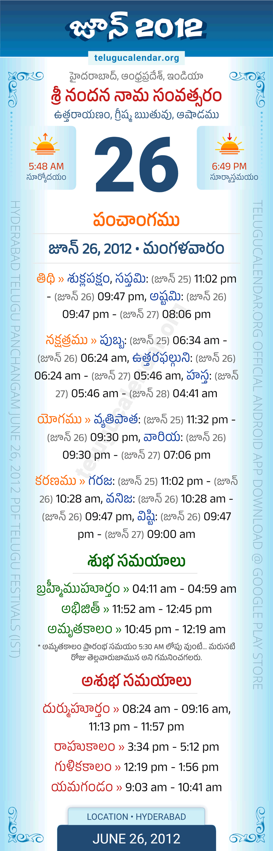 Download » June 26, 2012 » Hyderabad, Andhra Pradesh Telugu Calendar Panchangam Daily Sheet with Auspicious and Inauspicious Timings.
