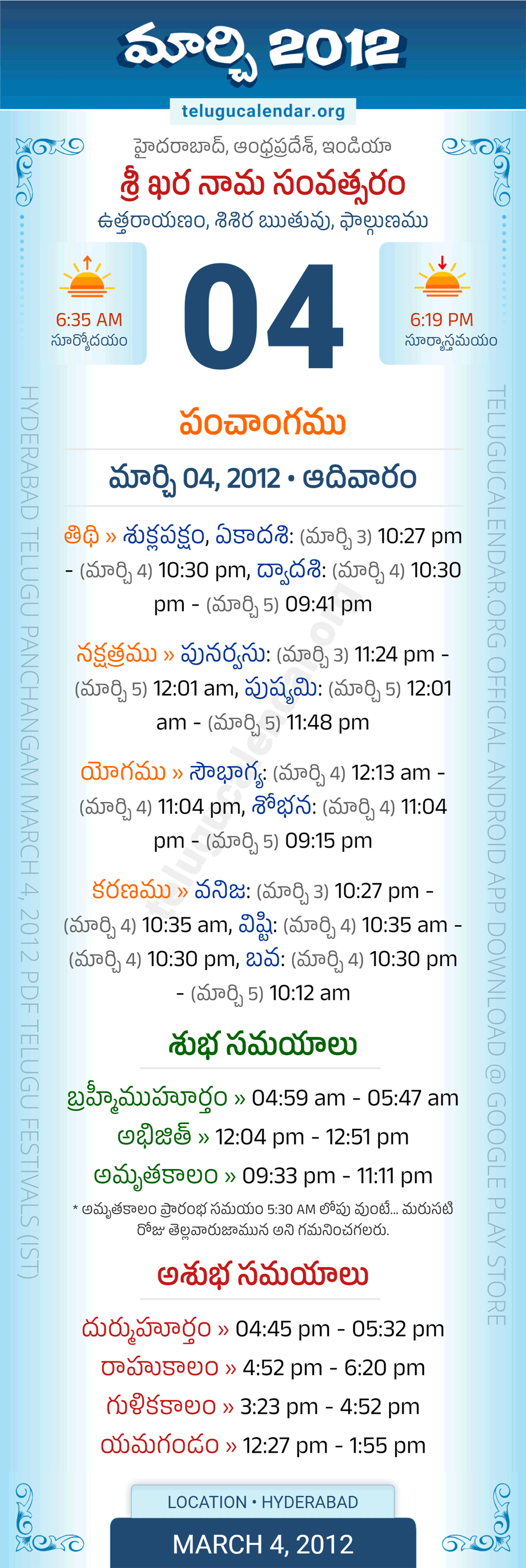 Download » March 4, 2012 » Hyderabad, Andhra Pradesh Telugu Calendar Panchangam Daily Sheet with Auspicious and Inauspicious Timings.