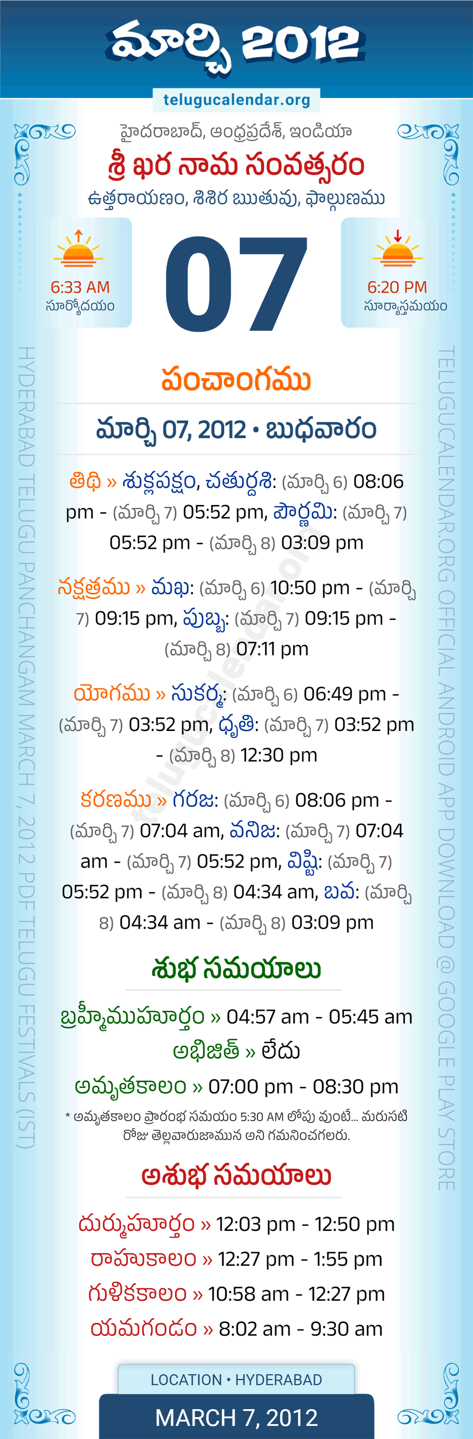 Download » March 7, 2012 » Hyderabad, Andhra Pradesh Telugu Calendar Panchangam Daily Sheet with Auspicious and Inauspicious Timings.