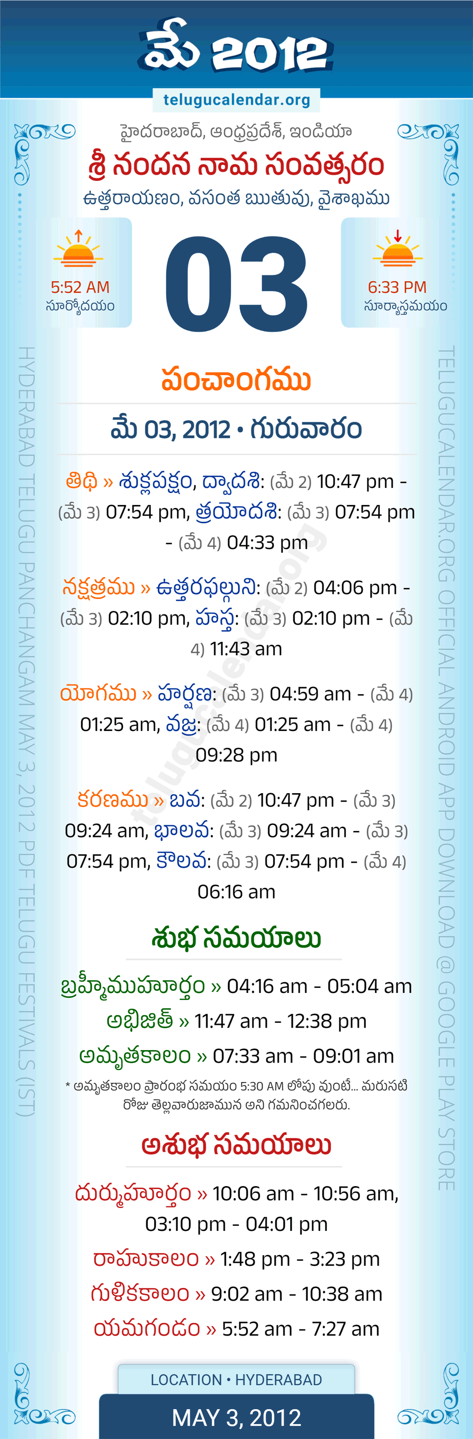 Download » May 3, 2012 » Hyderabad, Andhra Pradesh Telugu Calendar Panchangam Daily Sheet with Auspicious and Inauspicious Timings.