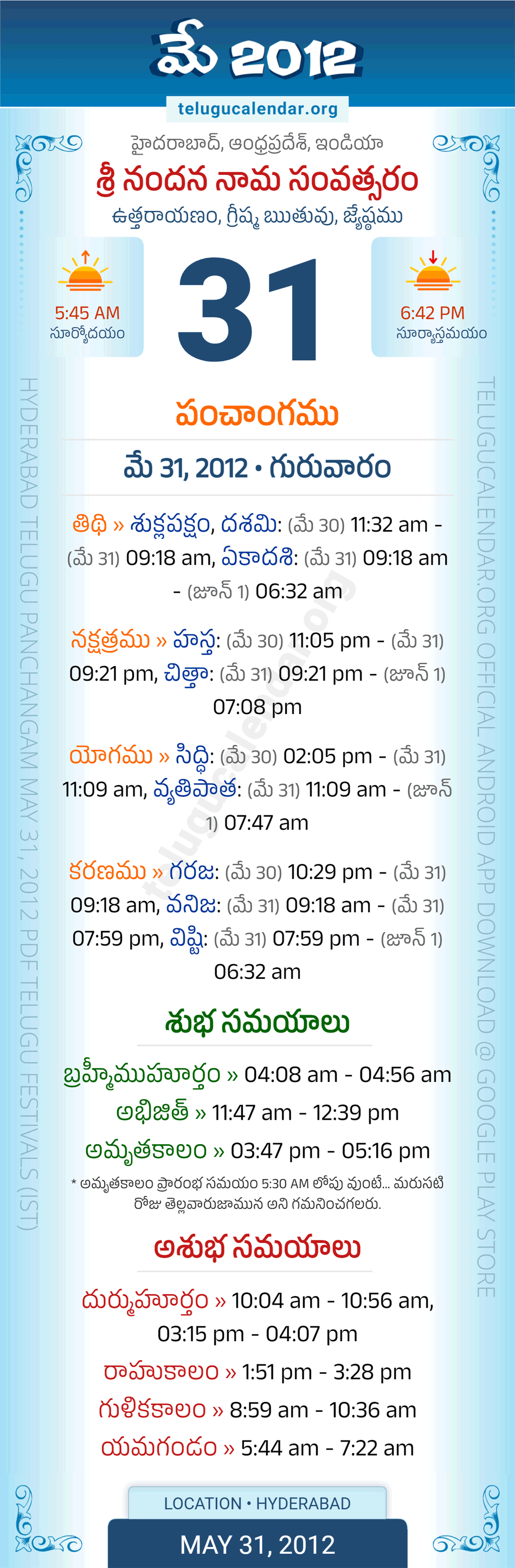 Download » May 31, 2012 » Hyderabad, Andhra Pradesh Telugu Calendar Panchangam Daily Sheet with Auspicious and Inauspicious Timings.