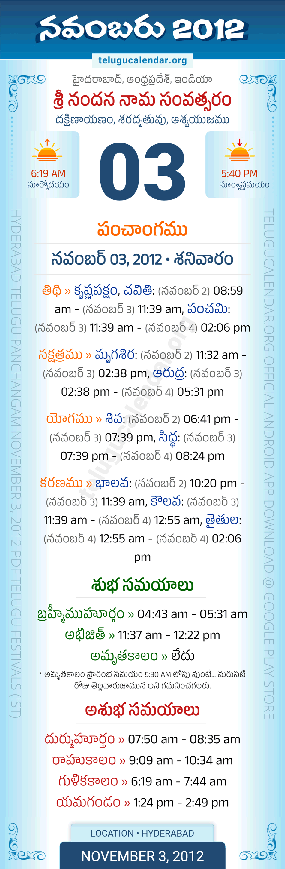 Download » November 3, 2012 » Hyderabad, Andhra Pradesh Telugu Calendar Panchangam Daily Sheet with Auspicious and Inauspicious Timings.