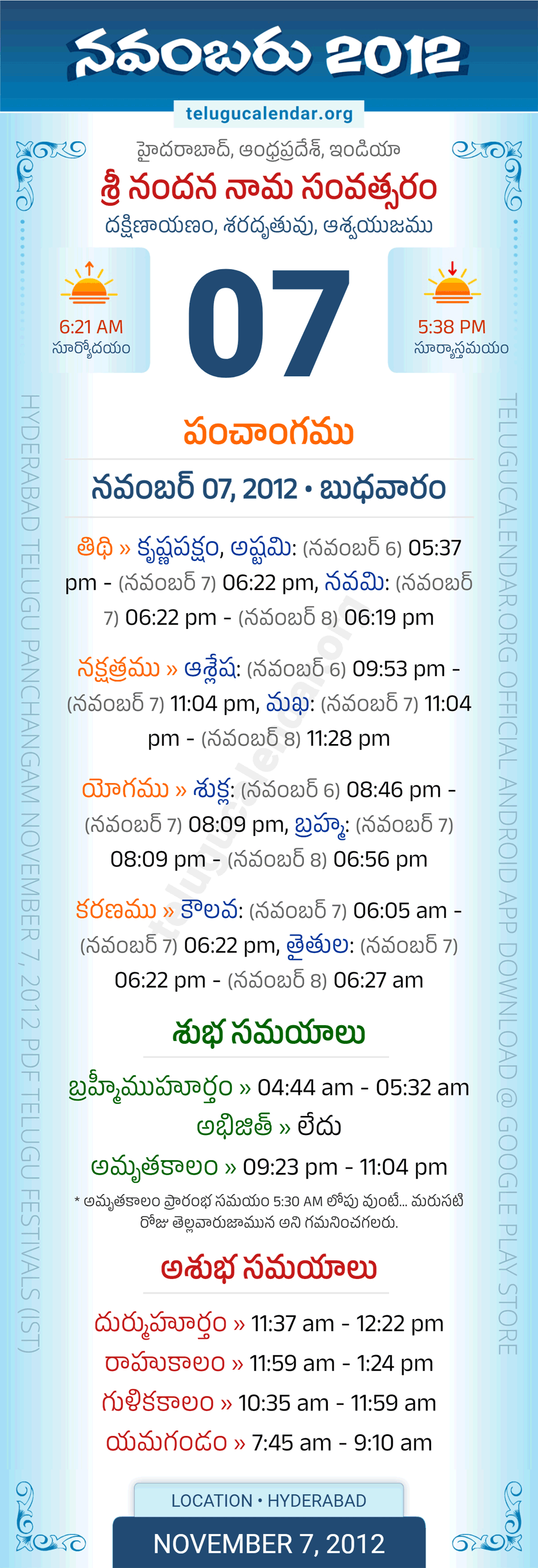 Download » November 7, 2012 » Hyderabad, Andhra Pradesh Telugu Calendar Panchangam Daily Sheet with Auspicious and Inauspicious Timings.