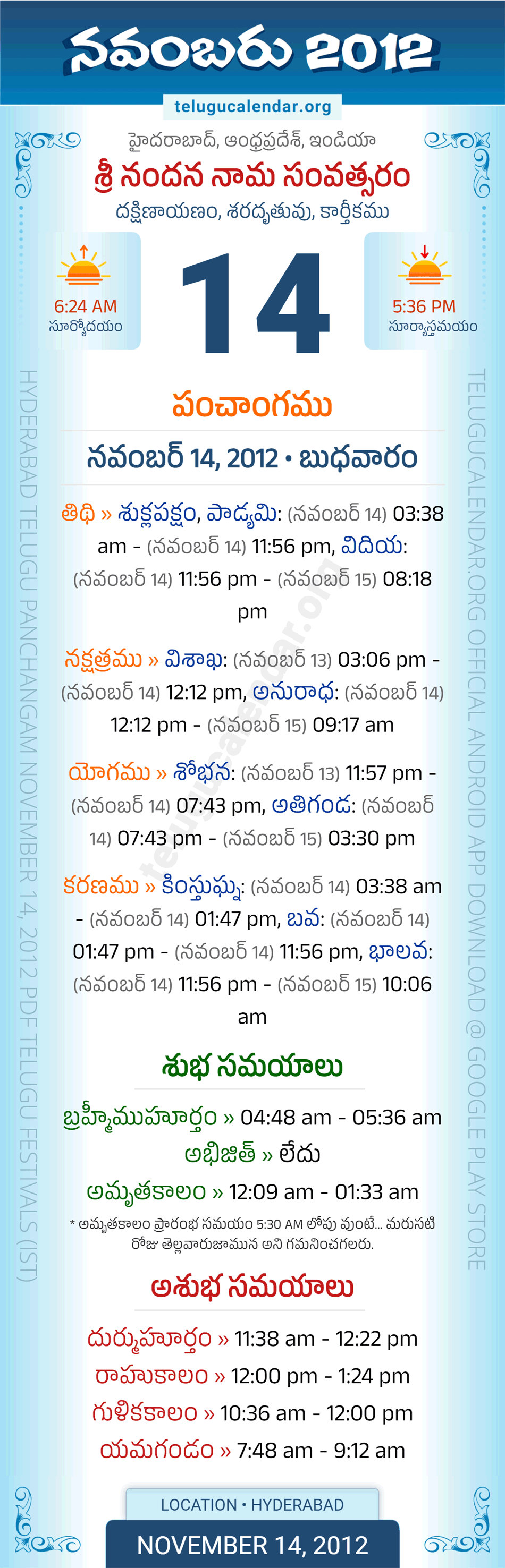Download » November 14, 2012 » Hyderabad, Andhra Pradesh Telugu Calendar Panchangam Daily Sheet with Auspicious and Inauspicious Timings.