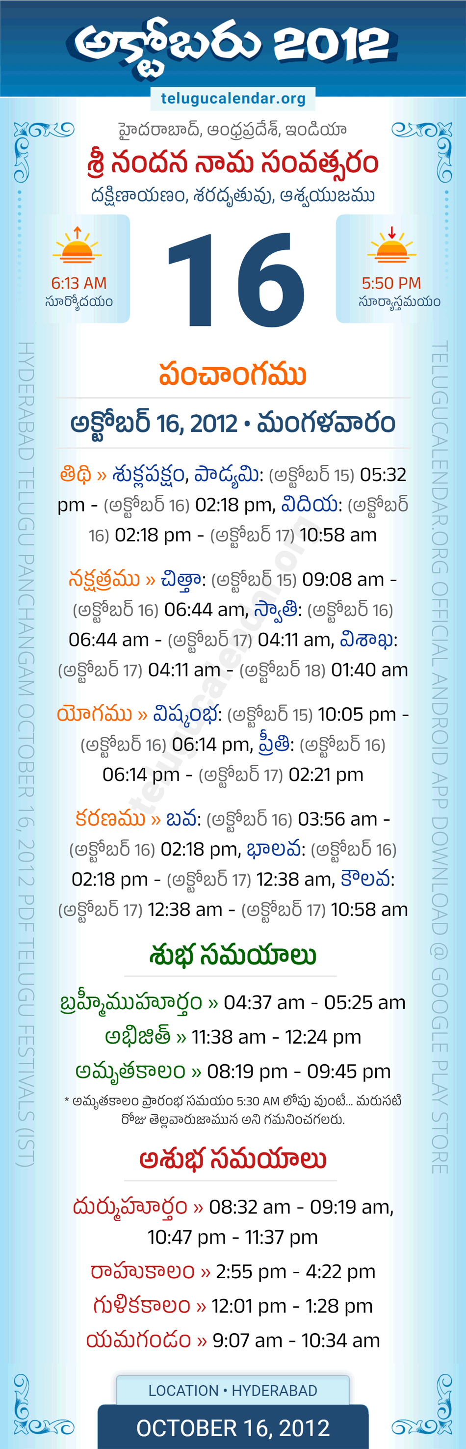 Download » October 16, 2012 » Hyderabad, Andhra Pradesh Telugu Calendar Panchangam Daily Sheet with Auspicious and Inauspicious Timings.