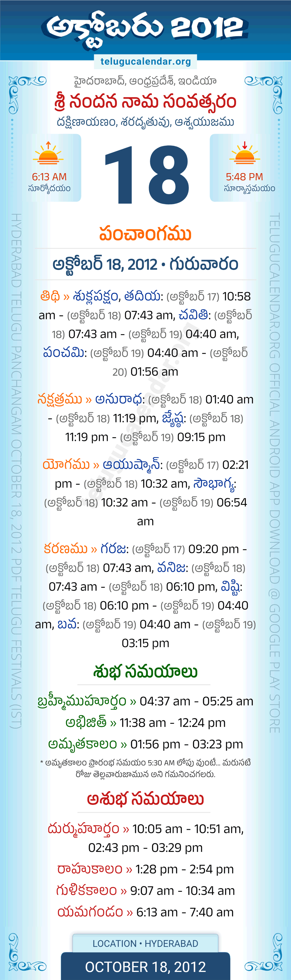 Download » October 18, 2012 » Hyderabad, Andhra Pradesh Telugu Calendar Panchangam Daily Sheet with Auspicious and Inauspicious Timings.