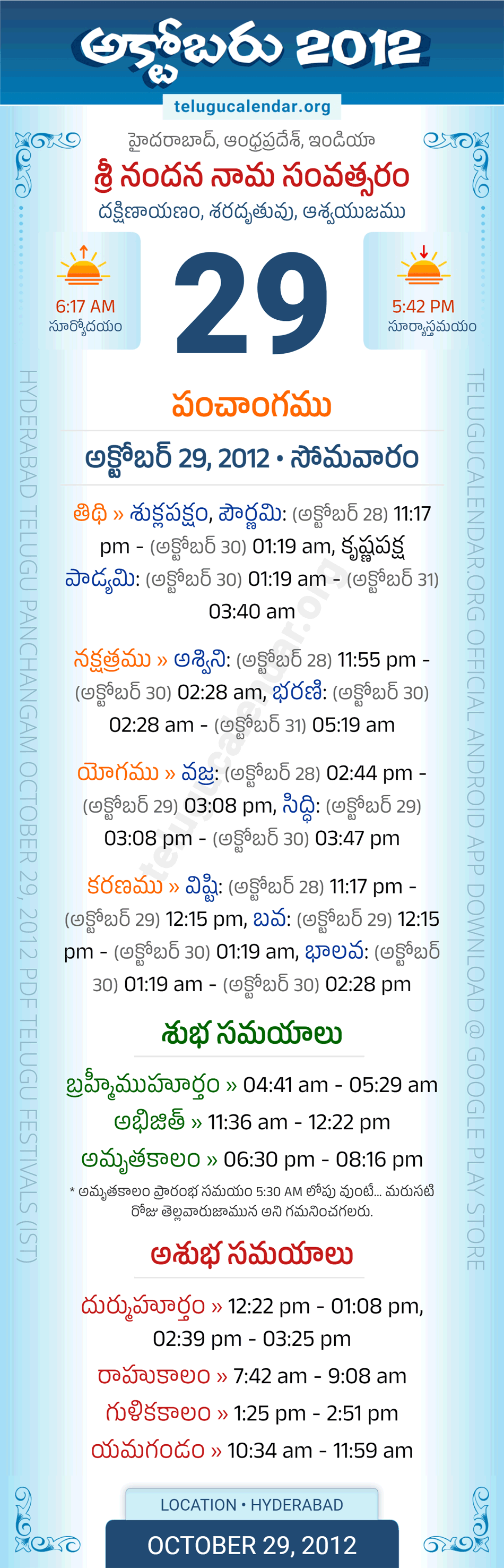 Download » October 29, 2012 » Hyderabad, Andhra Pradesh Telugu Calendar Panchangam Daily Sheet with Auspicious and Inauspicious Timings.