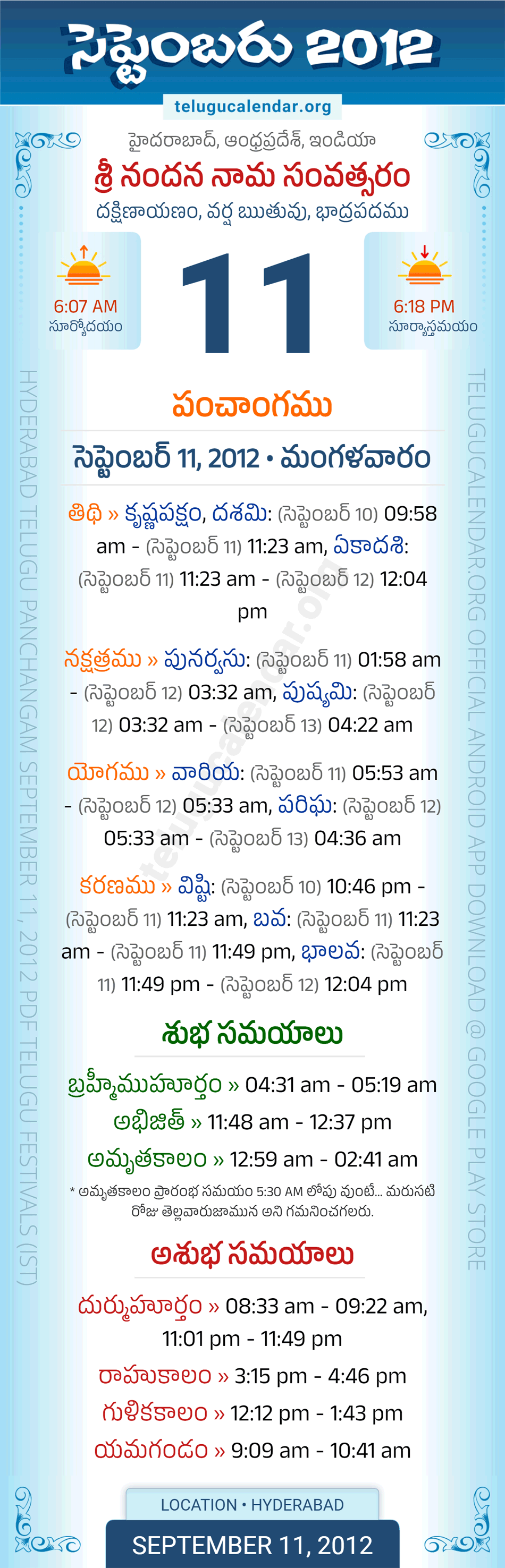 Download » September 11, 2012 » Hyderabad, Andhra Pradesh Telugu Calendar Panchangam Daily Sheet with Auspicious and Inauspicious Timings.