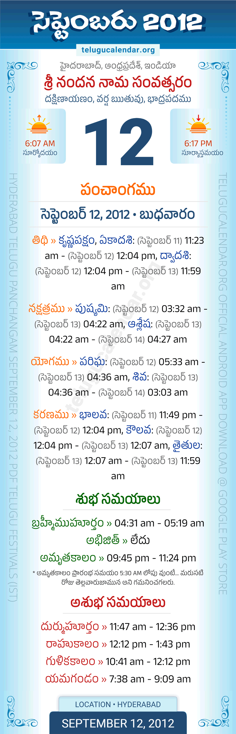 Download » September 12, 2012 » Hyderabad, Andhra Pradesh Telugu Calendar Panchangam Daily Sheet with Auspicious and Inauspicious Timings.