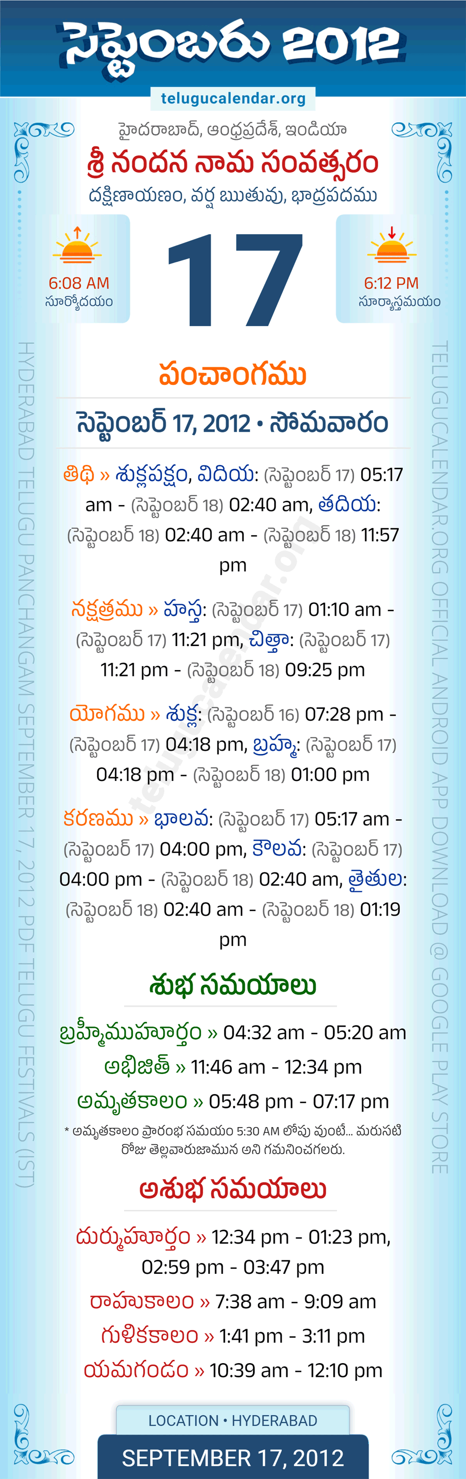 Download » September 17, 2012 » Hyderabad, Andhra Pradesh Telugu Calendar Panchangam Daily Sheet with Auspicious and Inauspicious Timings.