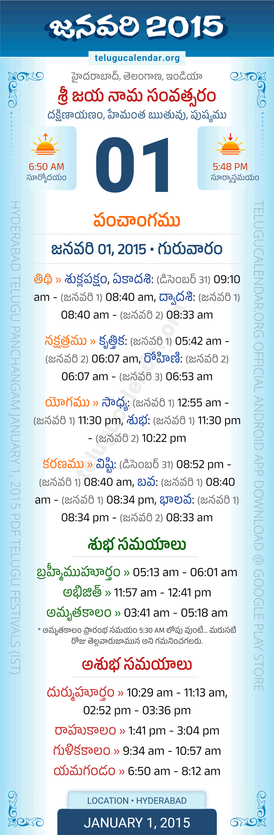 Download » January 1, 2015 » Hyderabad, Telangana Telugu Calendar Panchangam Daily Sheet with Auspicious and Inauspicious Timings.