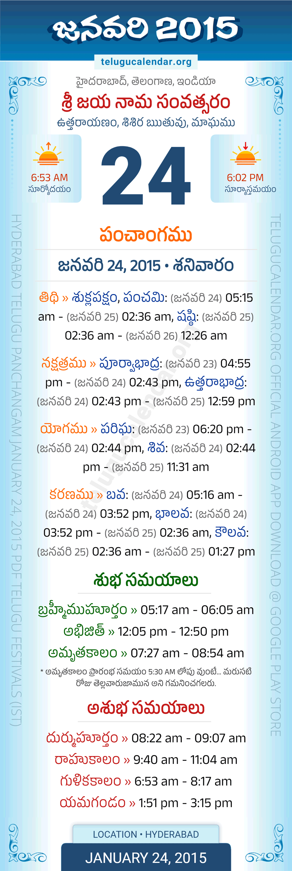 Download » January 24, 2015 » Hyderabad, Telangana Telugu Calendar Panchangam Daily Sheet with Auspicious and Inauspicious Timings.