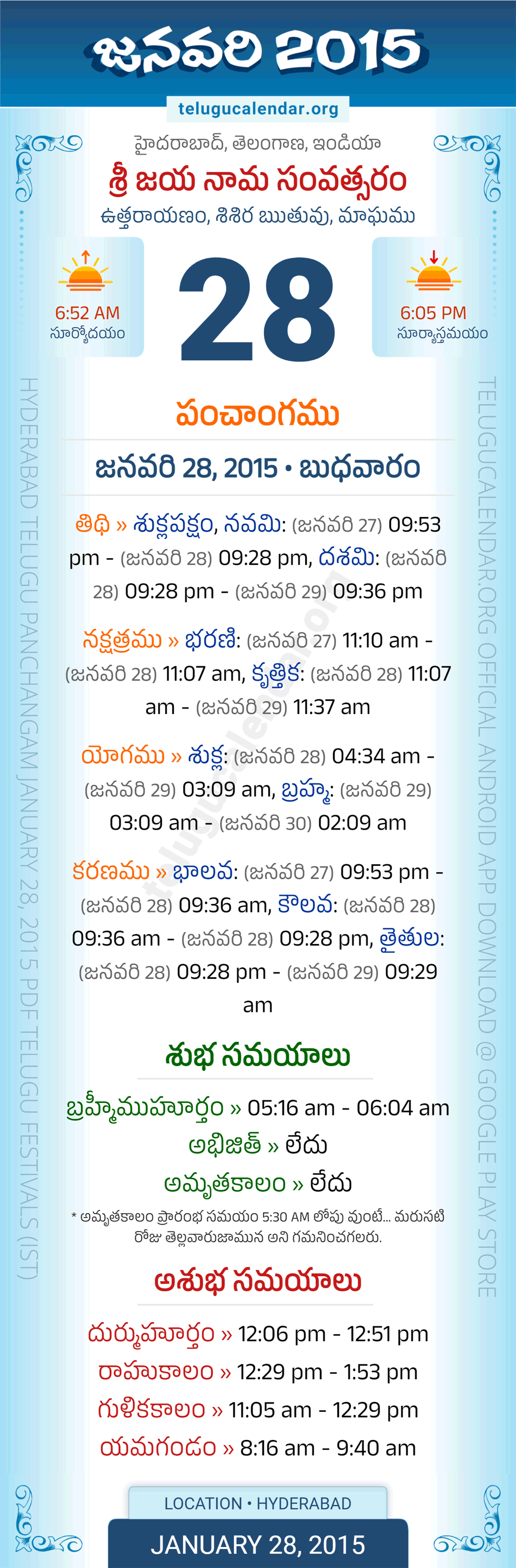 Download » January 28, 2015 » Hyderabad, Telangana Telugu Calendar Panchangam Daily Sheet with Auspicious and Inauspicious Timings.