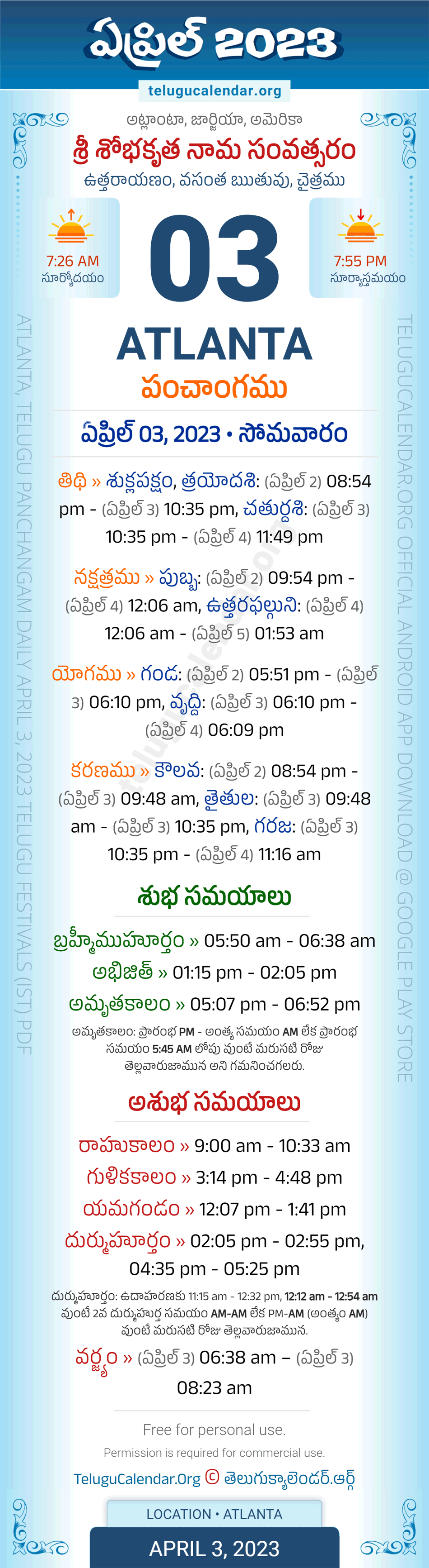 Download » April 3, 2023 » Atlanta (USA) Telugu Panchangam Daily Sheet with Auspicious and Inauspicious Timings.
