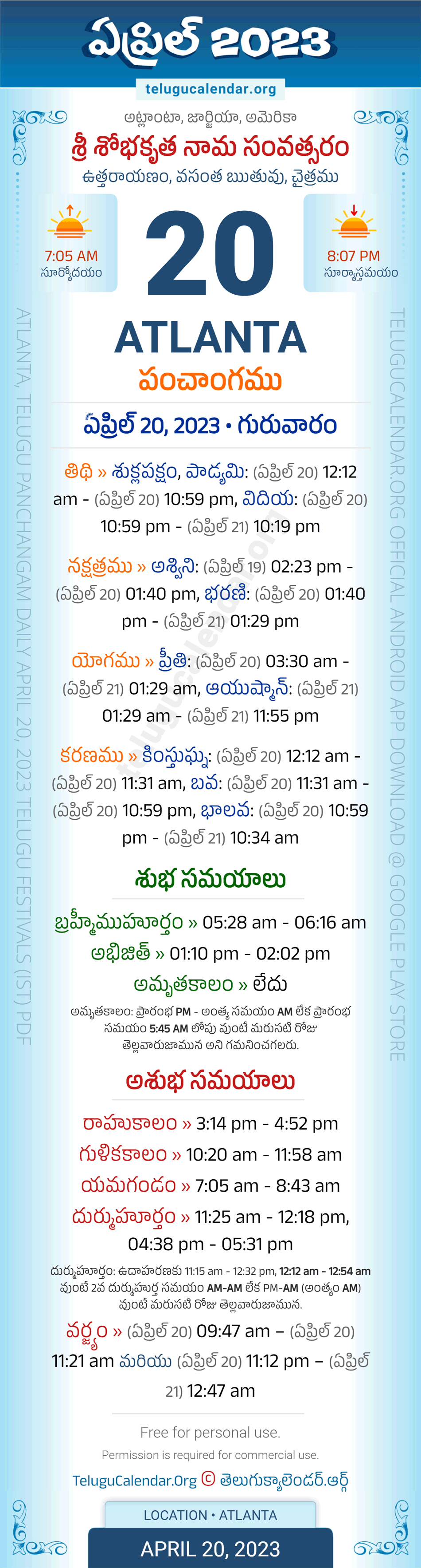 Download » April 20, 2023 » Atlanta (USA) Telugu Panchangam Daily Sheet with Auspicious and Inauspicious Timings.