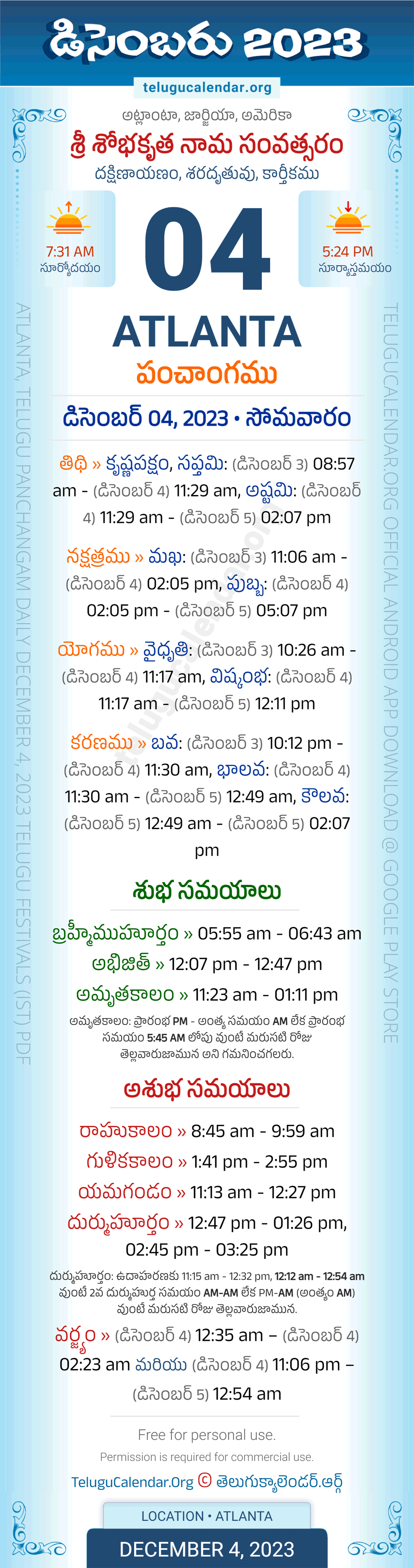 Download » December 4, 2023 » Atlanta (USA) Telugu Panchangam Daily Sheet with Auspicious and Inauspicious Timings.