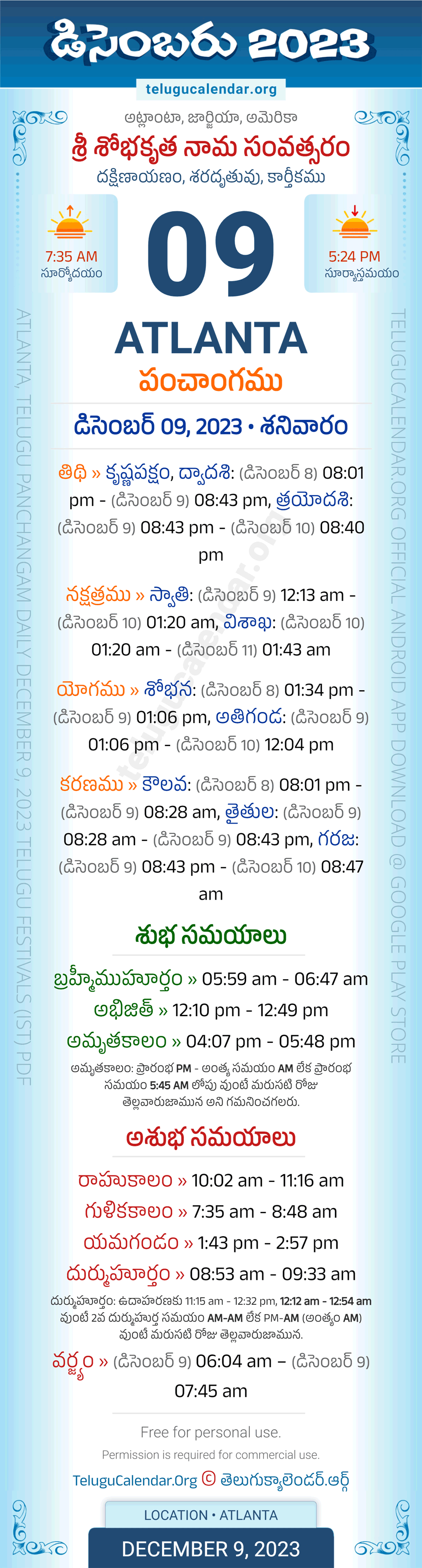 Download » December 9, 2023 » Atlanta (USA) Telugu Panchangam Daily Sheet with Auspicious and Inauspicious Timings.